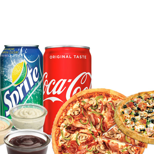 2- 10″ Pizza with 2 toppings, 2 dips, and 2 Cans of pop